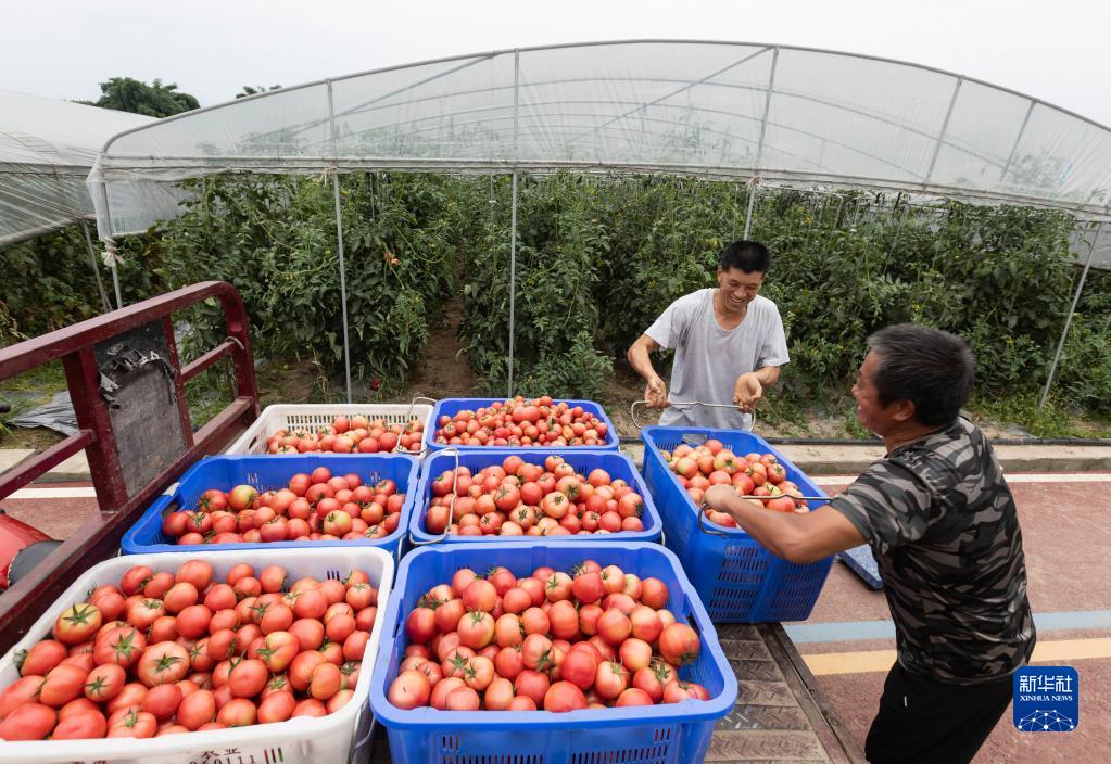 在东风堰灌溉区域之一的夹江县甘江镇金银河村,村民将采摘的西红柿装车(6月23日摄)。