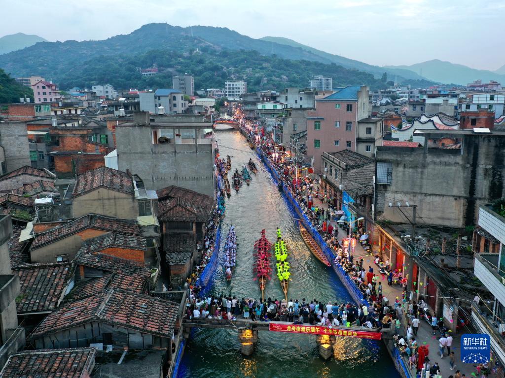 人们在福州市长乐区三溪村穿村而过的小溪中划龙舟(2023年6月18日摄,无人机照片)。