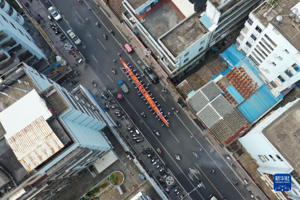 福州市连江县龙舟爱好者转运赠送马祖乡亲的新龙舟(2023年5月31日摄,无人机照片)。