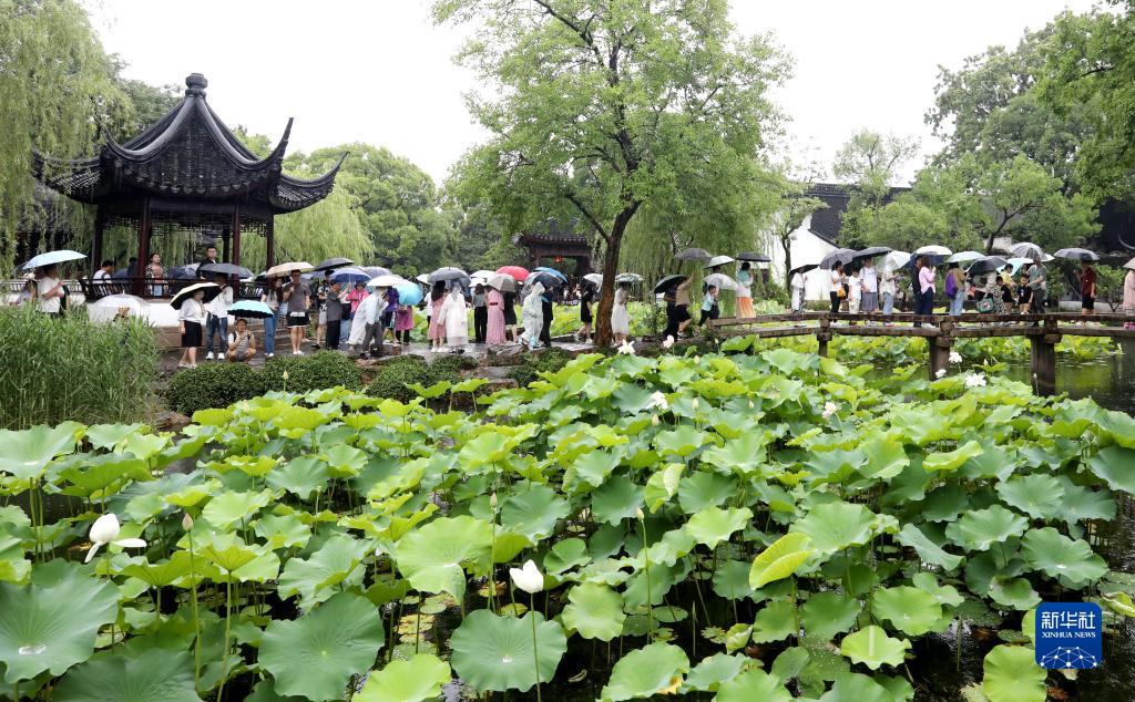 6月24日,在江苏省苏州市,游客在雨中游览拙政园。