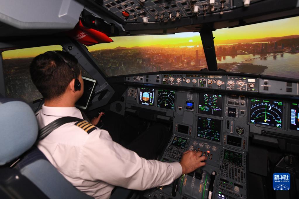 在广东珠海翔翼飞行训练中心,飞行员在模拟机中模拟飞越深圳城市上空(6月13日摄)。