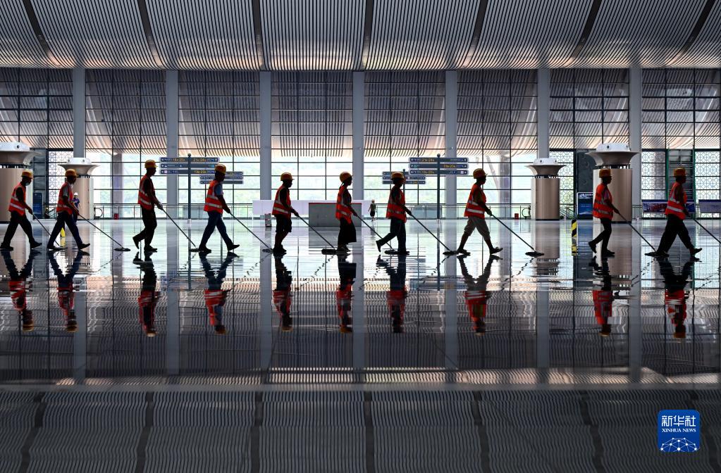 6月19日,清洁工人在福厦高铁新建厦门北站候车大厅清洁地面。
