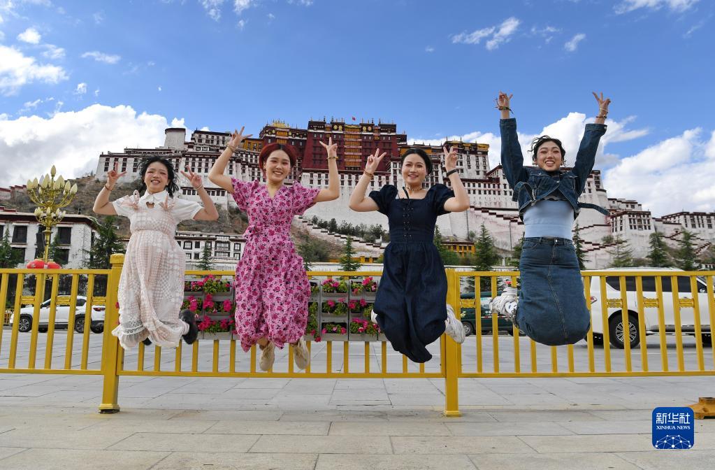 游客在布达拉宫广场上合影留念(6月16日摄)。