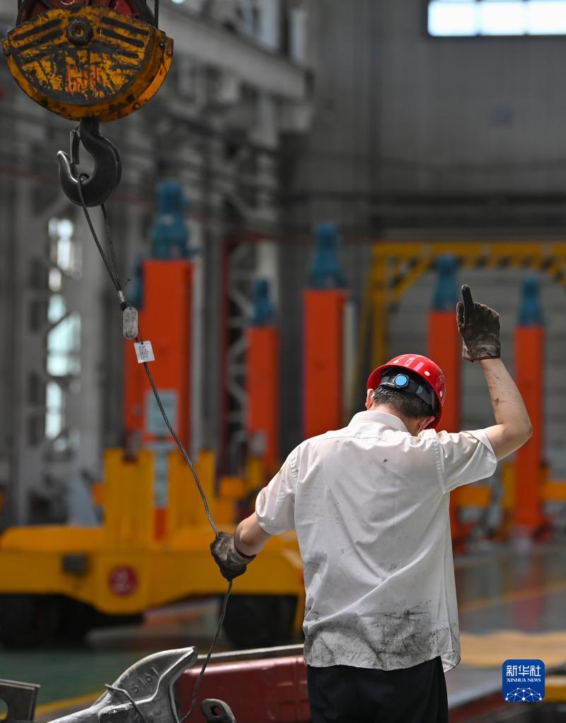 在中国铁路太原局集团有限公司太原机务段太北检修车间,工作人员固定好部件后提示天车司机开始吊运(6月20日摄)。