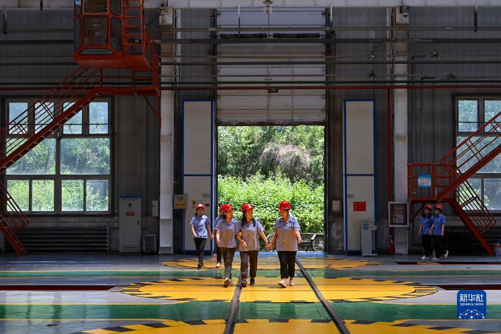 在中国铁路太原局集团有限公司太原机务段太北检修车间,部分天车司机结束作业后走出车间(6月20日摄)。