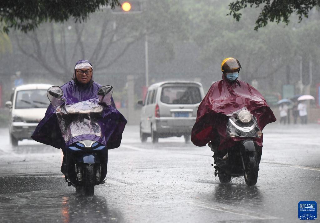 6月26日,在广西南宁市滨湖路,市民冒雨出行。
