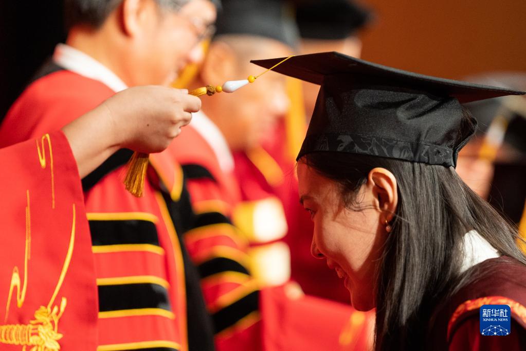6月26日,在中国人民大学2023年学位授予仪式现场,一名学生参加拨穗仪式。