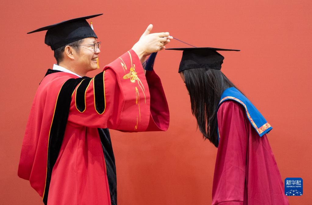 6月26日,在中国人民大学2023年学位授予仪式现场,教授周勇为一名毕业生拨穗。