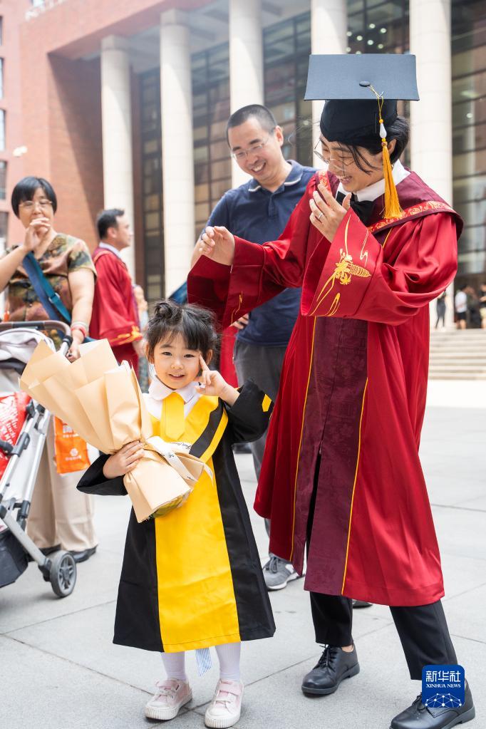 6月26日,中国人民大学一名毕业生带着孩子参加典礼。