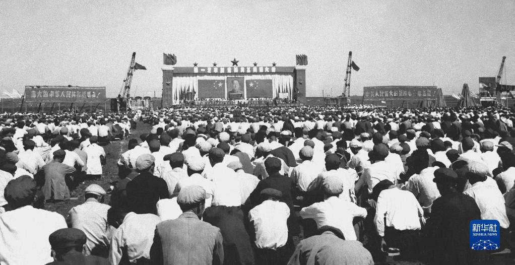 1953年7月15日,中国第一座汽车厂——第一汽车制造厂在吉林省长春市奠基,新中国汽车工业开始起步。这是一汽奠基典礼大会会场(资料照片)。