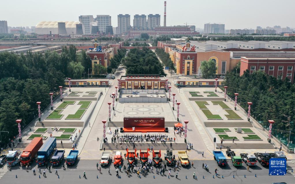 6月26日,一汽解放卡车在中国第一汽车集团有限公司厂区一号门前进行集中展示(无人机照片)。