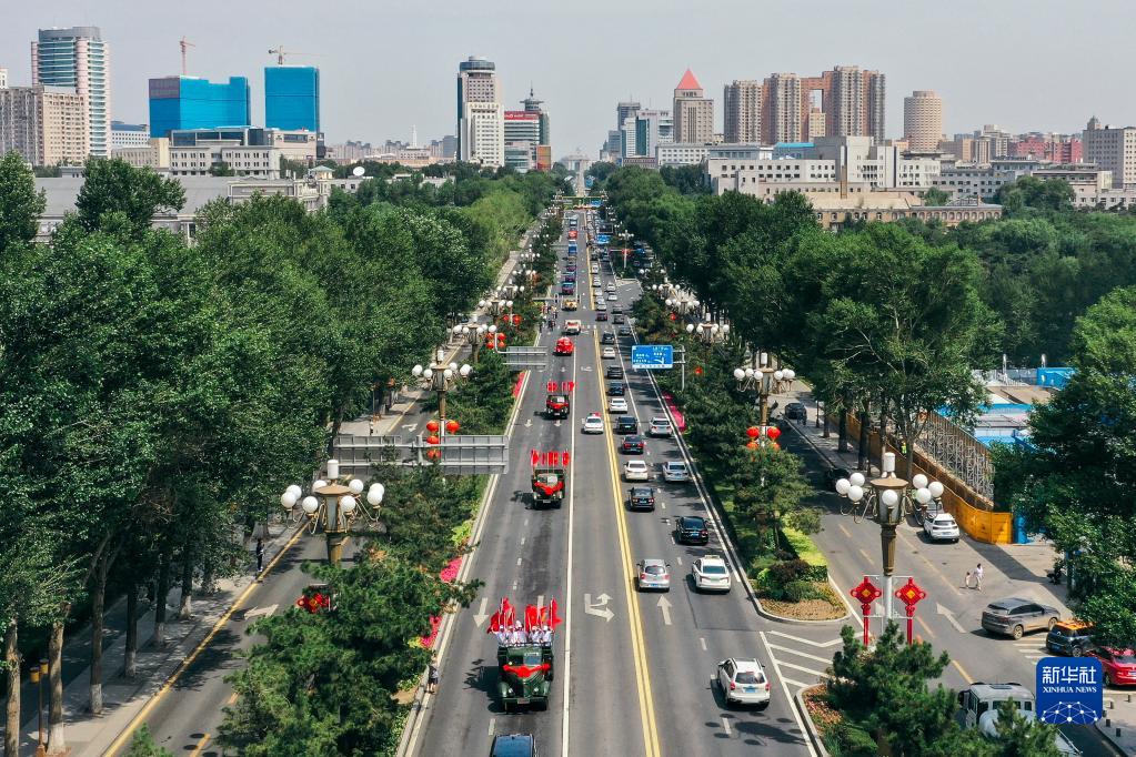 6月26日,一汽解放卡车行驶在长春的街道上(无人机照片)。
