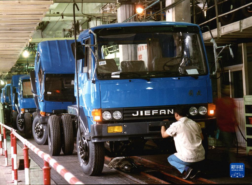 1995年,解放第三代产品6吨平头柴油车开始批量生产。这是工人在生产线上对车辆进行装配作业(资料照片)。