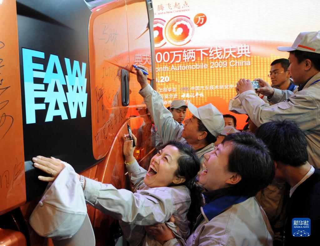2009年10月20日,2009年第1000万辆汽车在长春一汽诞生。中国成为继美、日之后第三个汽车年产破千万辆的国家,进入千万辆汽车大国行列。这是一汽解放的工人们在自己亲手生产的2009年中国第1000万辆车上签名。
