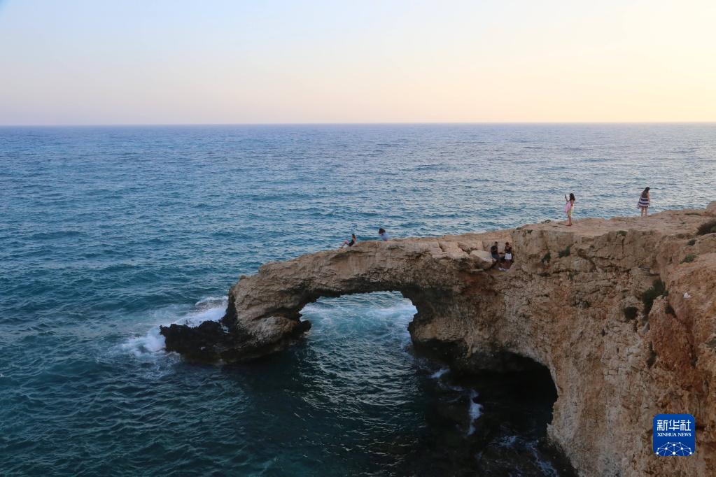 在塞浦路斯圣纳帕东部海蚀洞景区,一处海岸边海水侵蚀后形成的天然石桥“爱之桥”因美丽的景色成为游客打卡地。