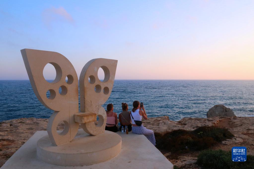 6月26日,人们在塞浦路斯圣纳帕“爱之桥”拍摄海边落日。