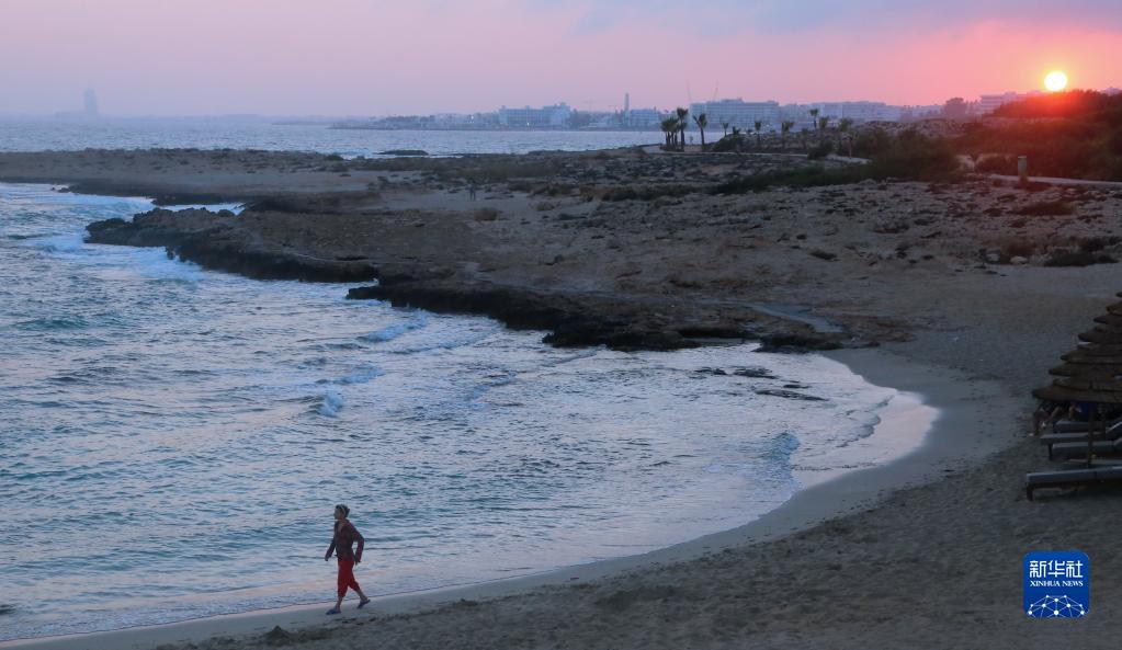 这是6月26日在塞浦路斯圣纳帕“爱之桥”附近拍摄的海边落日。