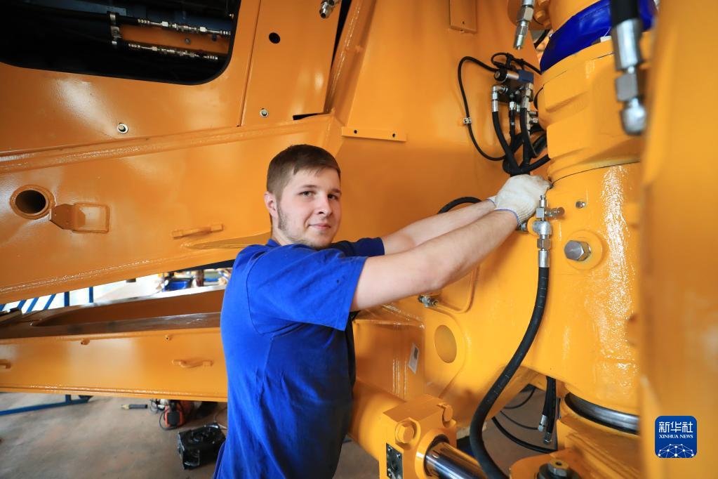 6月26日,工人在白俄罗斯明斯克州若基诺市的白俄罗斯汽车制造厂大型自卸车组装车间工作。
