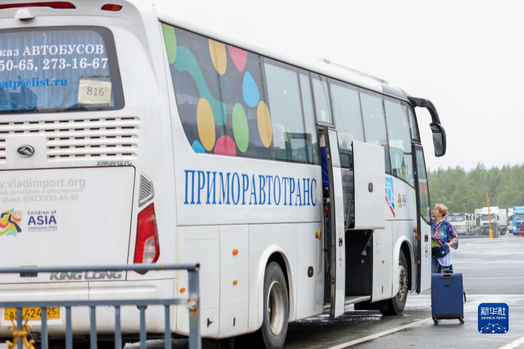 6月27日,旅客在珲春公路口岸乘坐旅游巴士。