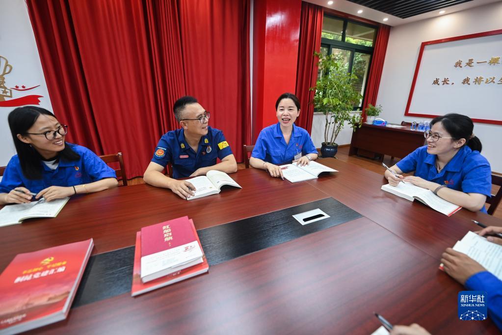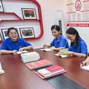 6月27日,胡晓丽(右二)等党员职工在桐昆集团的工作室内开展主题党日活动。