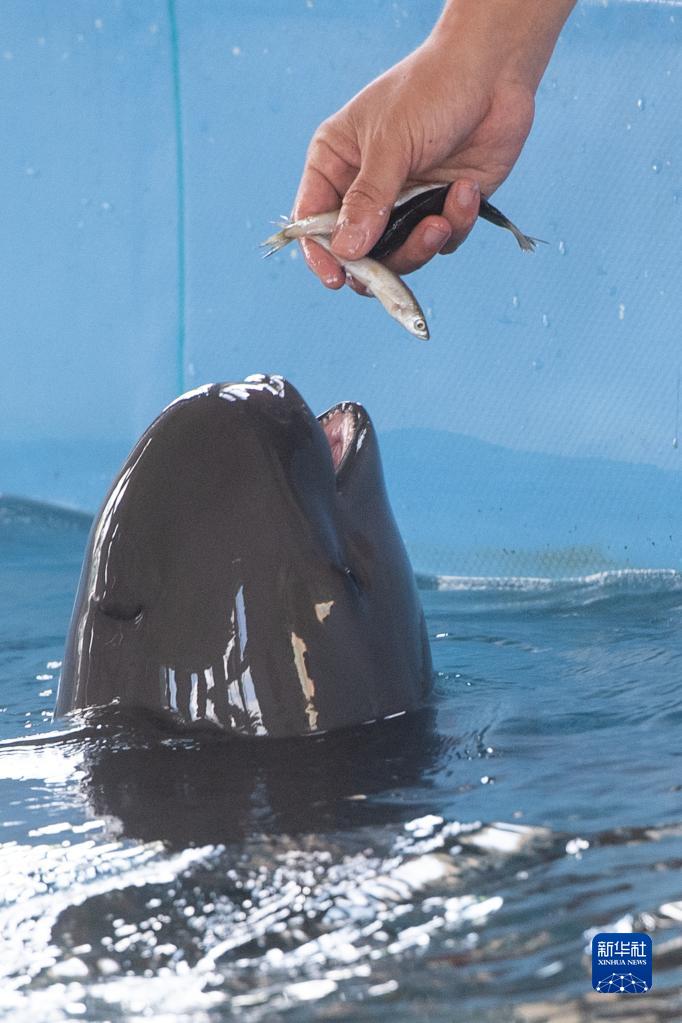 6月27日,中科院水生所白鱀豚馆饲养员给小江豚“F9C22”喂食。