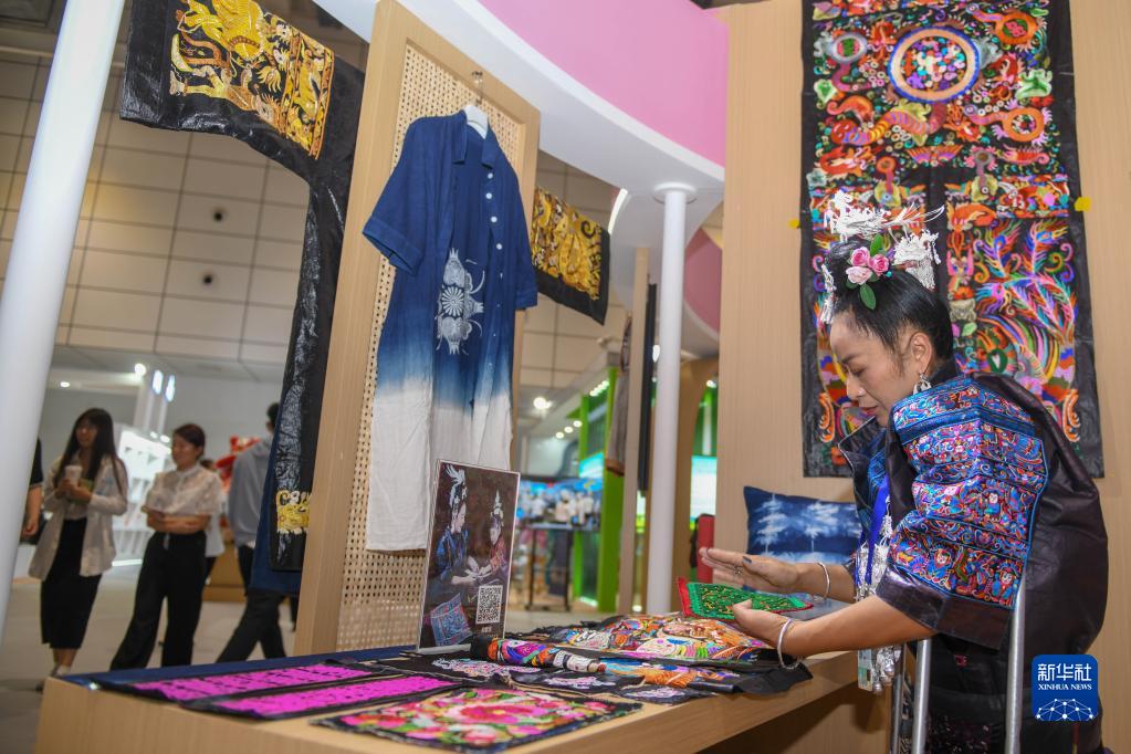 6月27日,在第四届全国残疾人展能节上,来自贵州的张艳梅展示自己制作的苗绣产品。