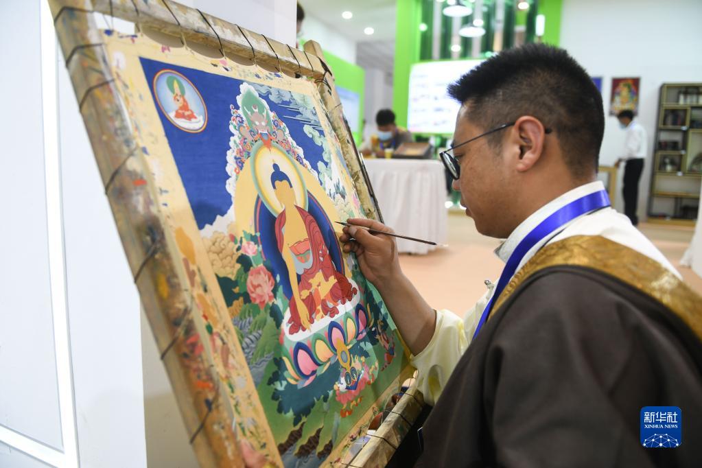 6月27日,在第四届全国残疾人展能节上,来自西藏的达增现场绘制唐卡。