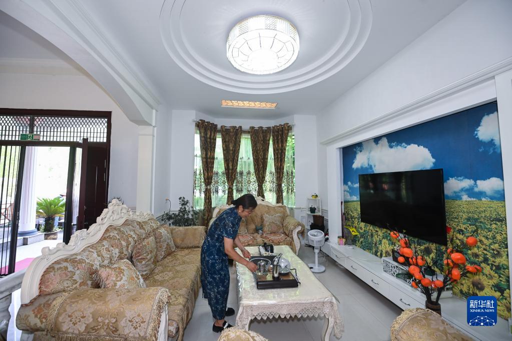 6月27日,浙江省建德市航头镇航川村的民宿主在整理民宿客厅。