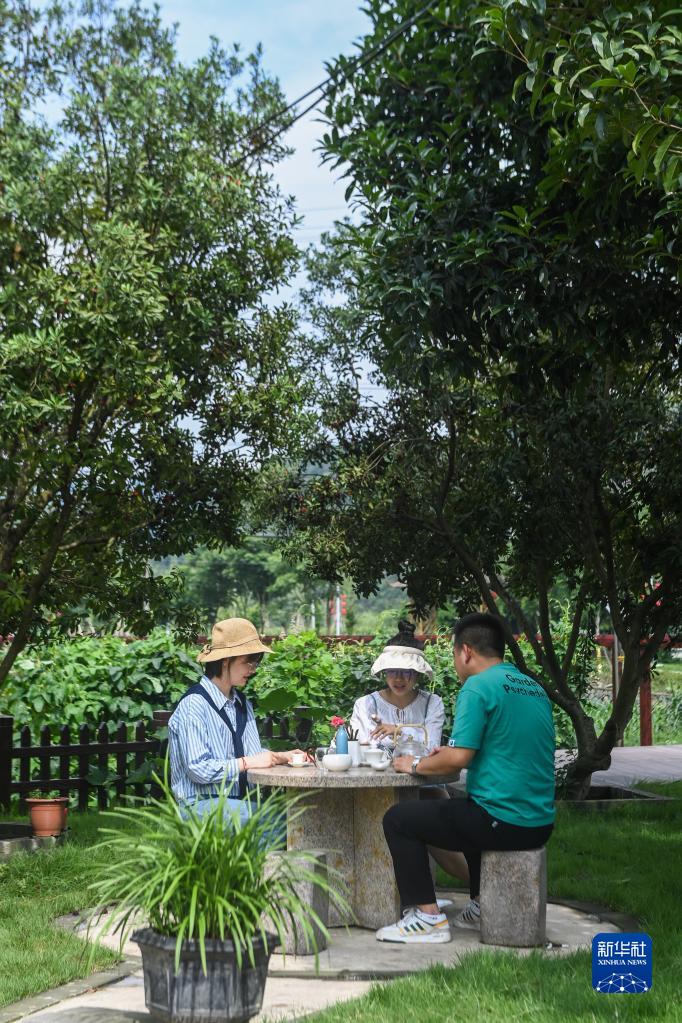 6月27日,游客在浙江省建德市航头镇航川村特色民宿的庭院里喝茶休憩。