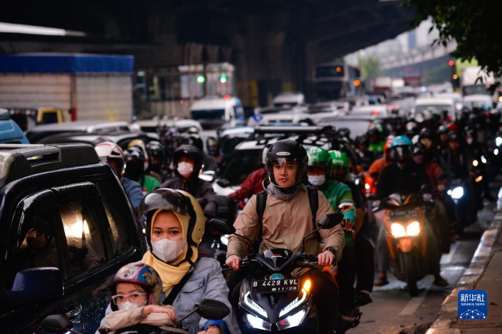 6月27日傍晚,在印度尼西亚雅加达东区的芝皮南切姆佩达克,人们在雅加达-万隆出城方向的道路上骑行。