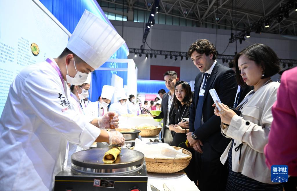 6月27日,与会嘉宾在第十四届夏季达沃斯论坛文化之夜现场观看天津特色美食制作。
