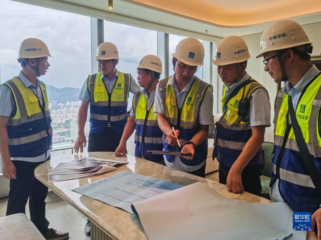 伍涛(左二)和同事在施工现场对整体施工效果和设计方案还原程度进行比对(6月26日摄)。