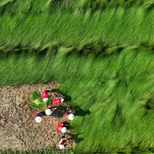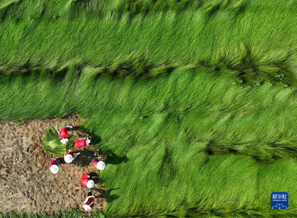 6月28日,在湖南省衡阳市祁东县金桥镇,南华大学电气工程学院的志愿者在收割蔺草(无人机照片)。