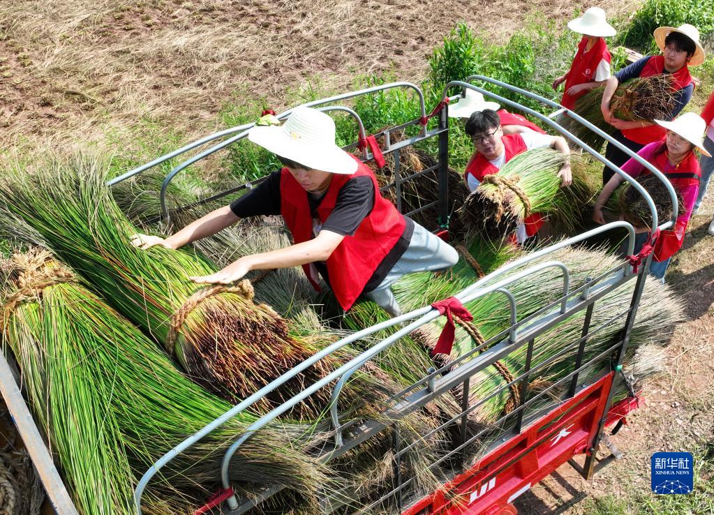 6月28日,在湖南省衡阳市祁东县金桥镇,南华大学电气工程学院的志愿者将收割的蔺草装车(无人机照片)。