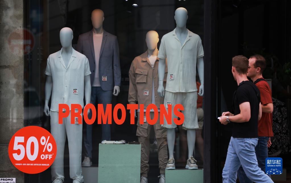6月28日,人们走过法国巴黎街头的打折季广告。
