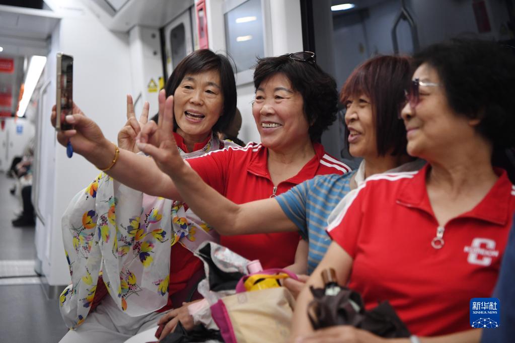 6月29日,乘客在兰州轨道交通2号线列车上拍照留念。