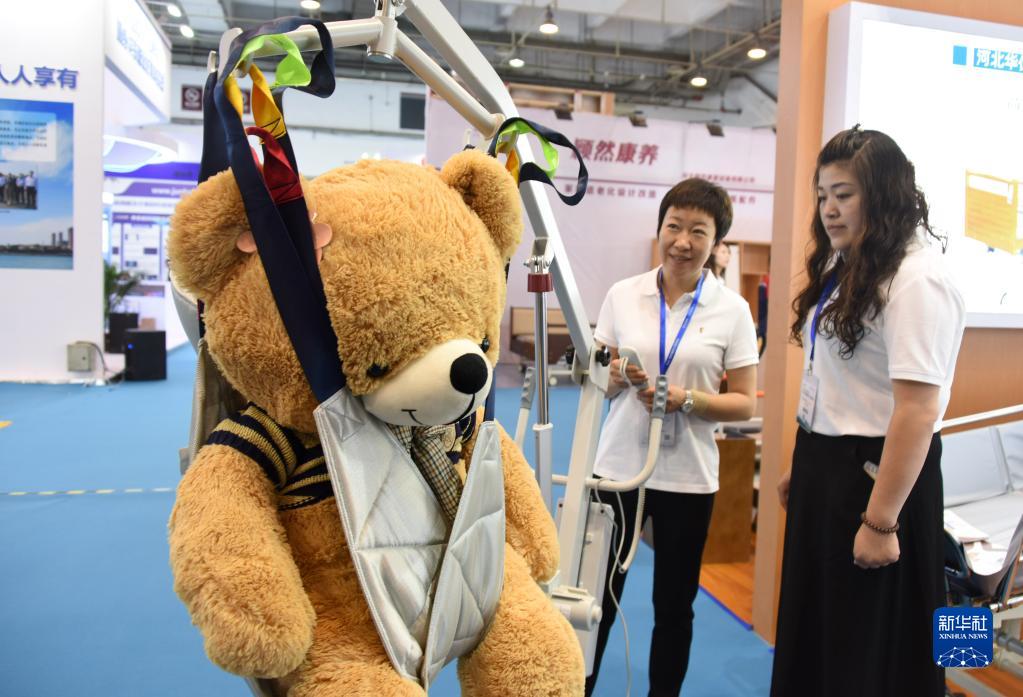 6月29日,一家参展企业工作人员在展会上展示一款护理电动移位器。