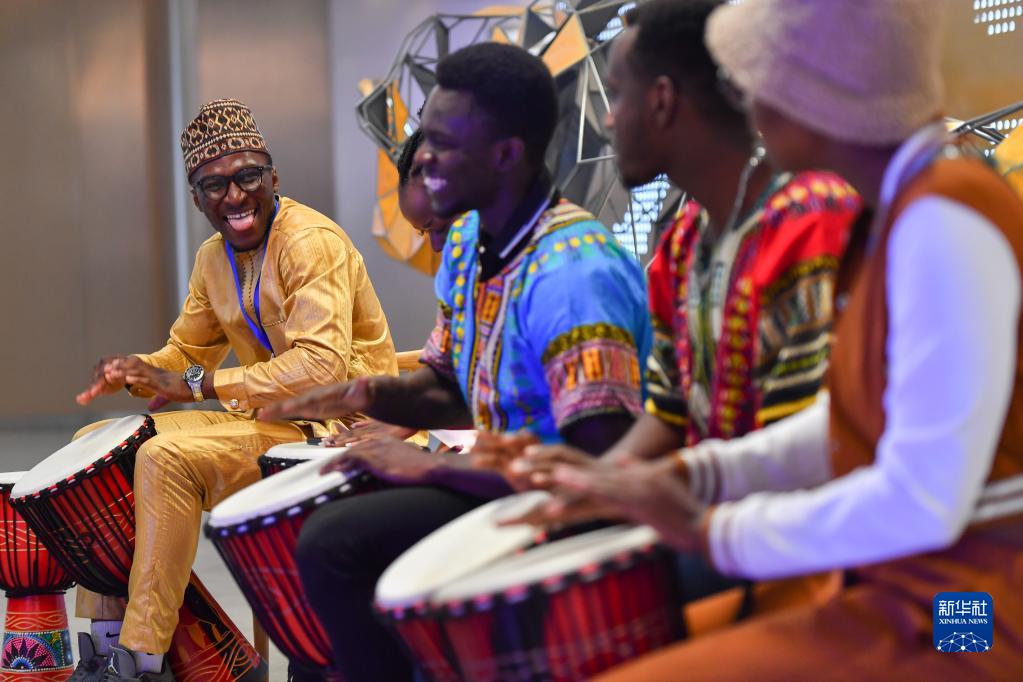 6月29日,在中非经贸合作促进创新示范园(湖南高桥大市场),来自非洲的表演者在进行非洲鼓表演。