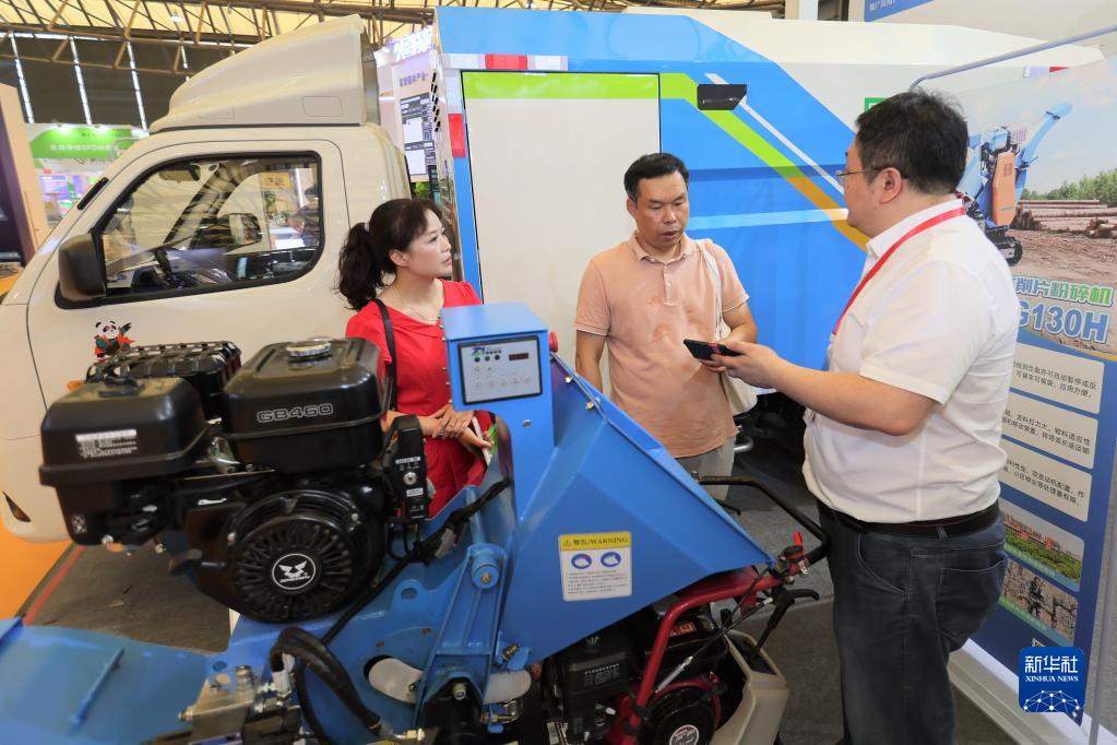 6月29日,参展商为参观者介绍树木削片粉碎设备。