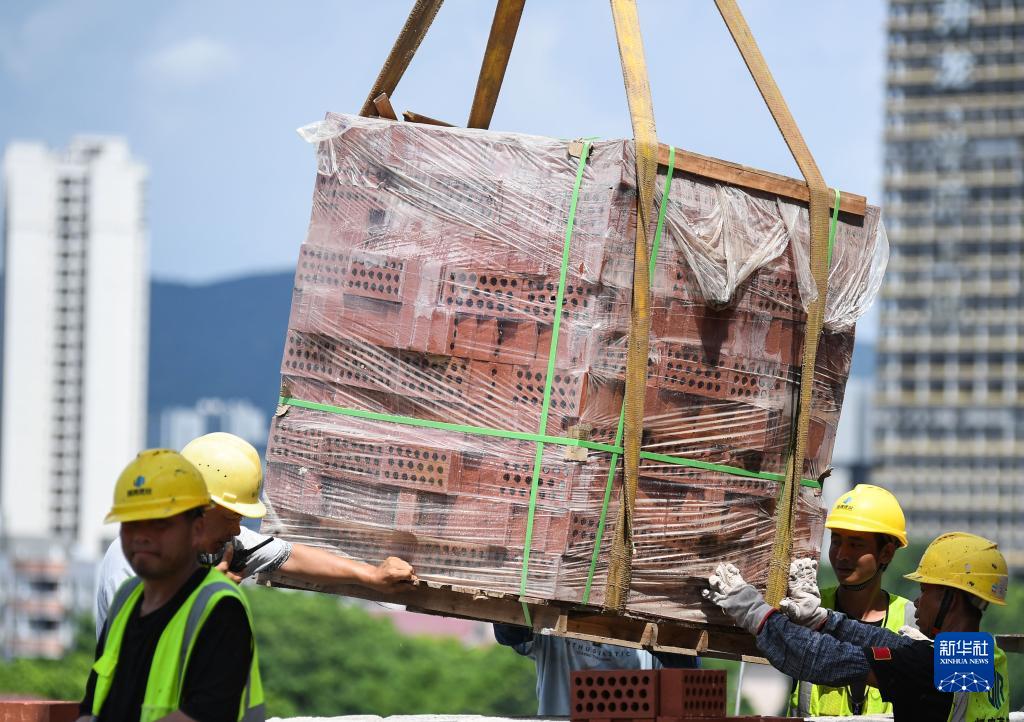 6月29日,在中建三局承建的西安电子科技大学广州研究院项目工地,工人在协助吊装材料。