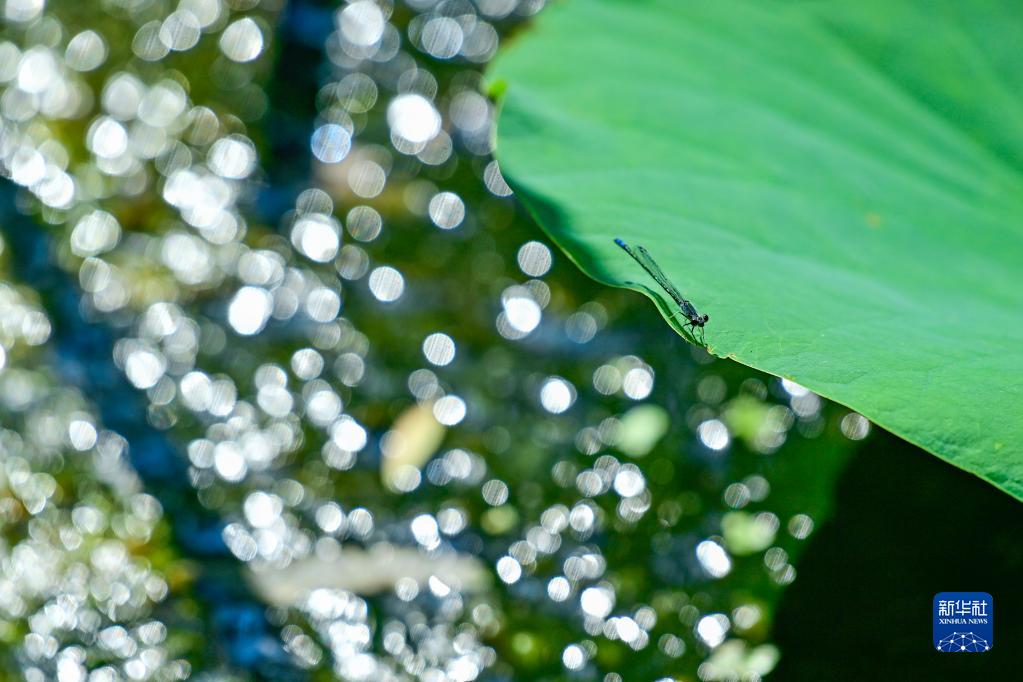 6月21日,在山东省青州市南阳河景区,一只豆娘停在荷叶上。