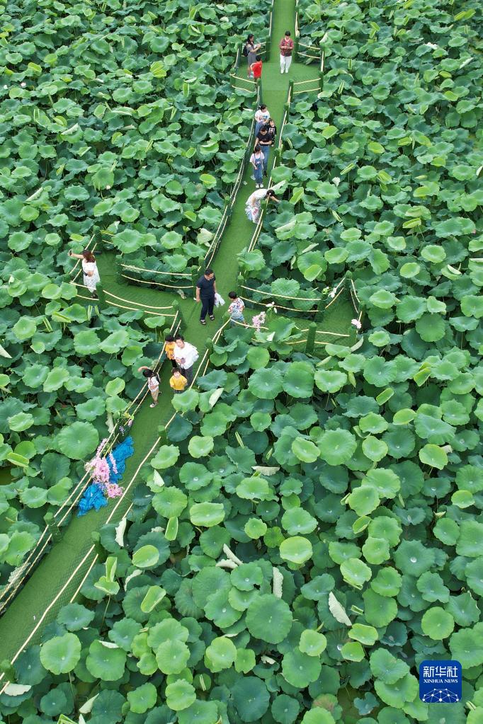 6月23日,在湖南省湘西土家族苗族自治州吉首市,游人在乾州古城胡家塘赏荷休闲(无人机照片)。