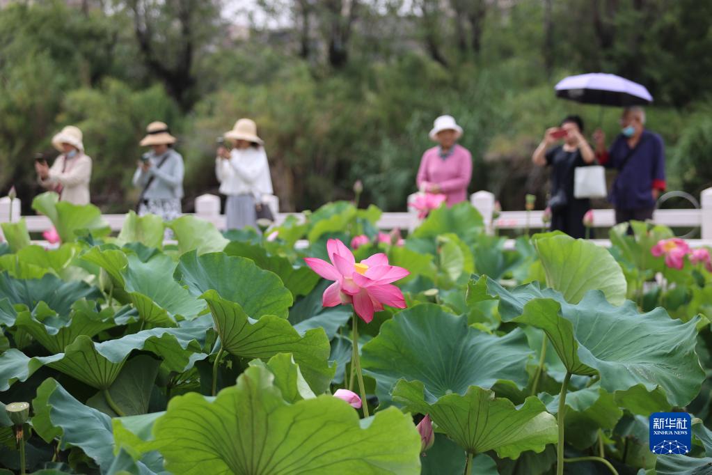 6月24日,游客在云南昆明大观公园赏荷拍照。