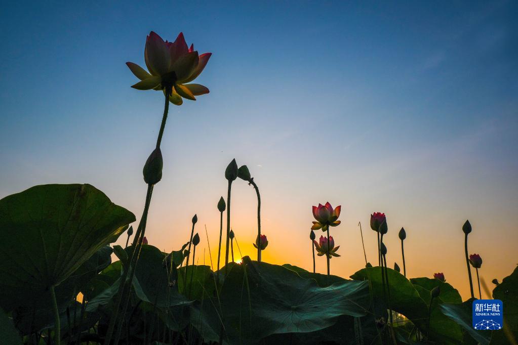 6月16日在山东省潍坊市坊子区太保庄街道前铺村拍摄的晨光中的荷花。