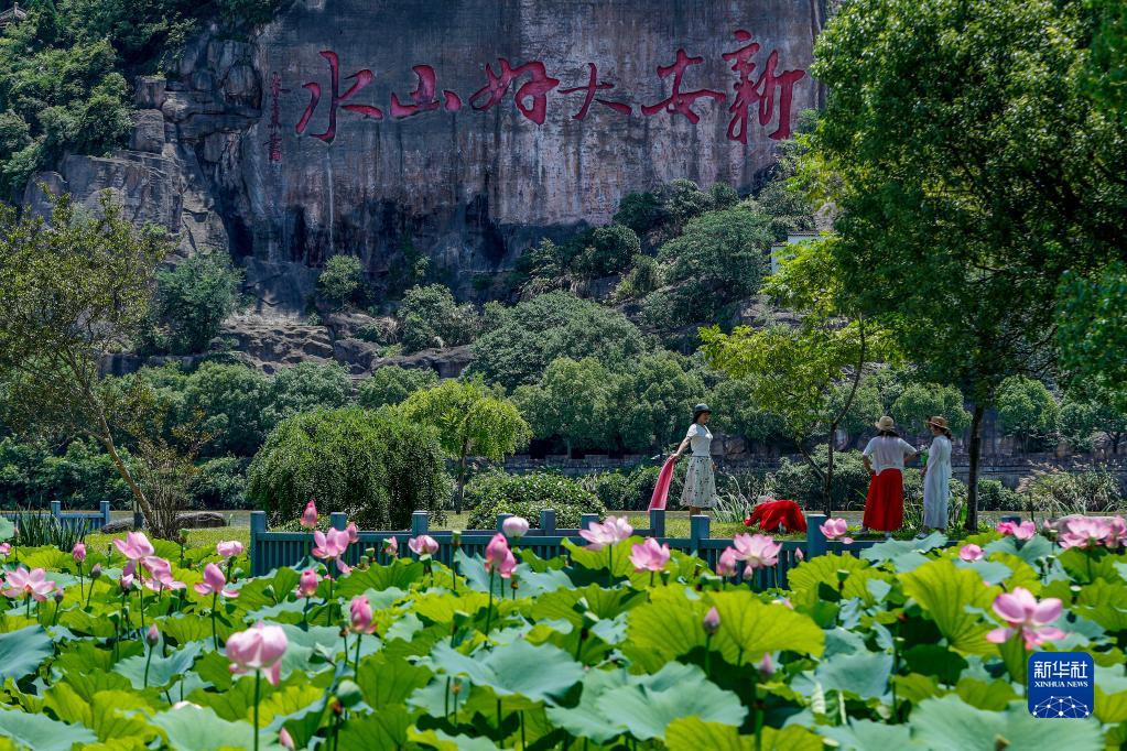 6月28日,游客在安徽省黄山市屯溪区新安江湿地公园游玩赏荷。