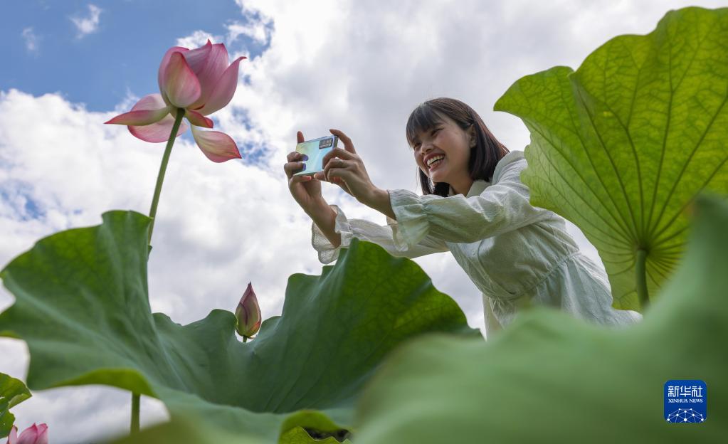 6月27日,游客在贵州省黔东南苗族侗族自治州岑巩县客楼镇下寨村荷塘拍照。