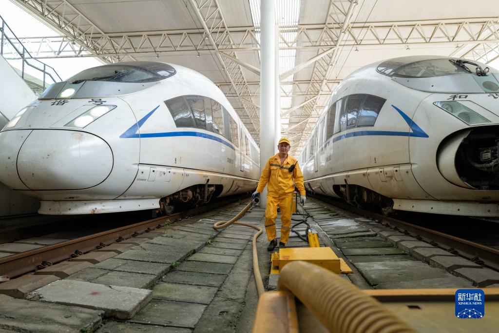 6月29日,温州保洁工区的工人对停靠温州南站的高铁列车进行上水卸污作业。