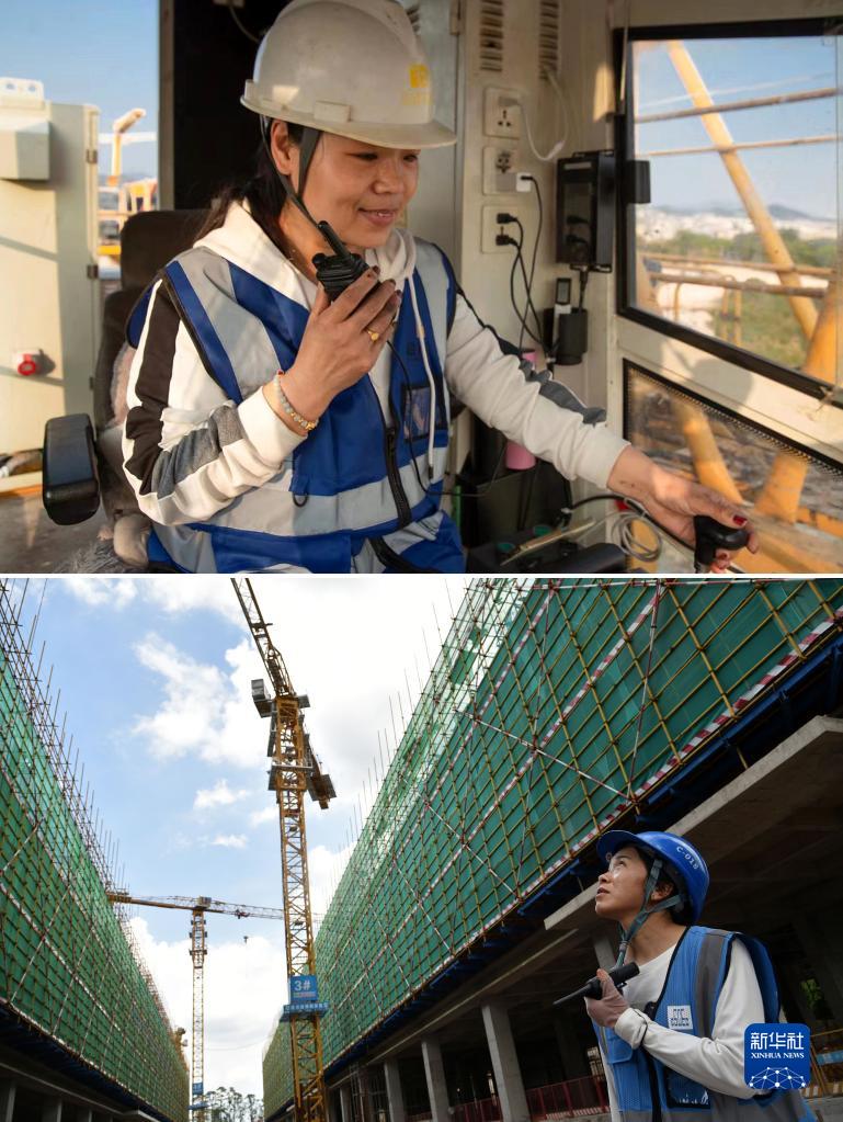 拼版照片:上图为张军丽在空中操作塔吊;下图为张坦在塔吊下指挥(6月29日摄)。新华社记者 周科 摄