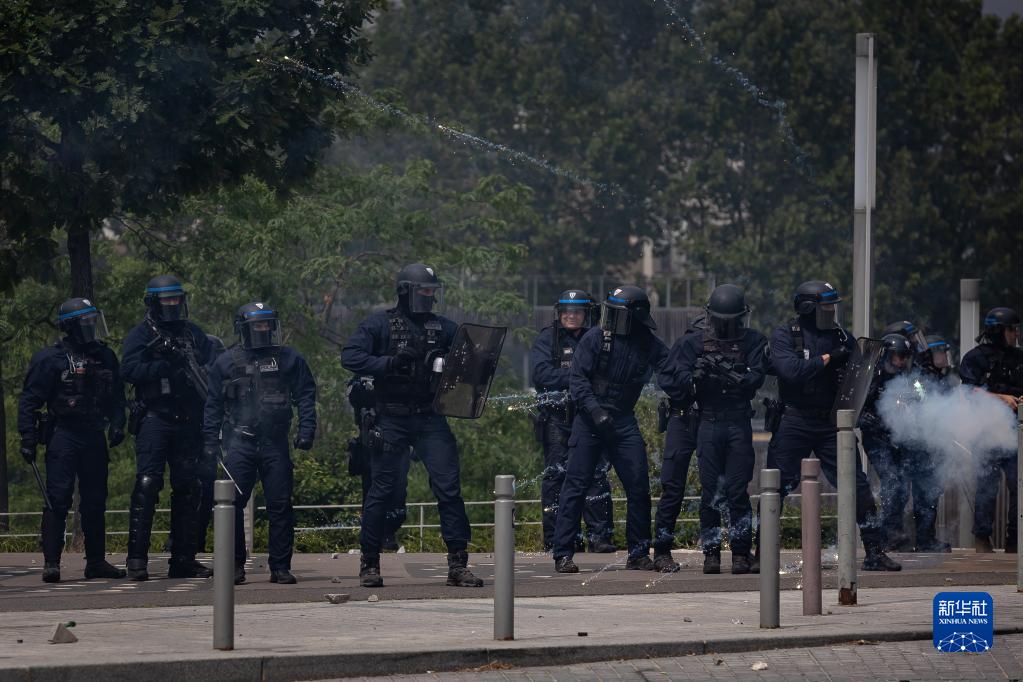 6月29日,在法国上塞纳省楠泰尔市,警察在骚乱现场警戒。