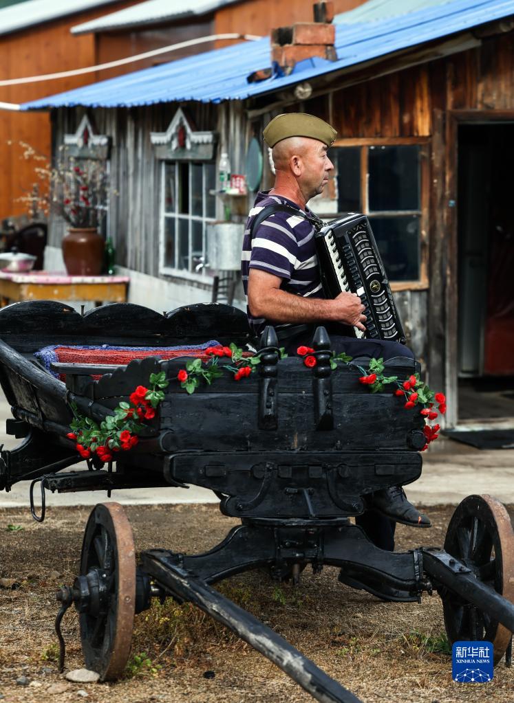 6月28日,萨沙在表演拉手风琴。萨沙的嫂子考占花是俄罗斯族,2004年开始经营俄罗斯族家庭游。